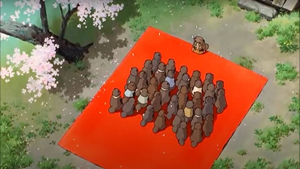The heroes are creatures called Tanuki, translated from the Japanese as “raccoons.” Indeed, they look like racoons: gray and white striped fur, black under the eyes, and sharp claws. Actually, they are a kind of dog, but for the purpose of the film, racoons will do.