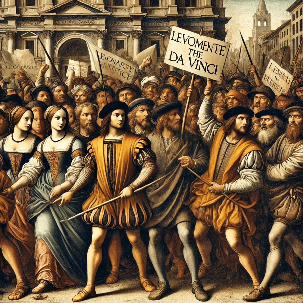 As I write many essays on political voice, I wanted many visuals of protest. Because I wanted images free from copyright, I turned to DALL-E. In 2023, I asked DALL-E for a “Leonardo da Vinci painting of people at a protest holding signs.” DALL-E provides four images. This is what the AI helped to create:
