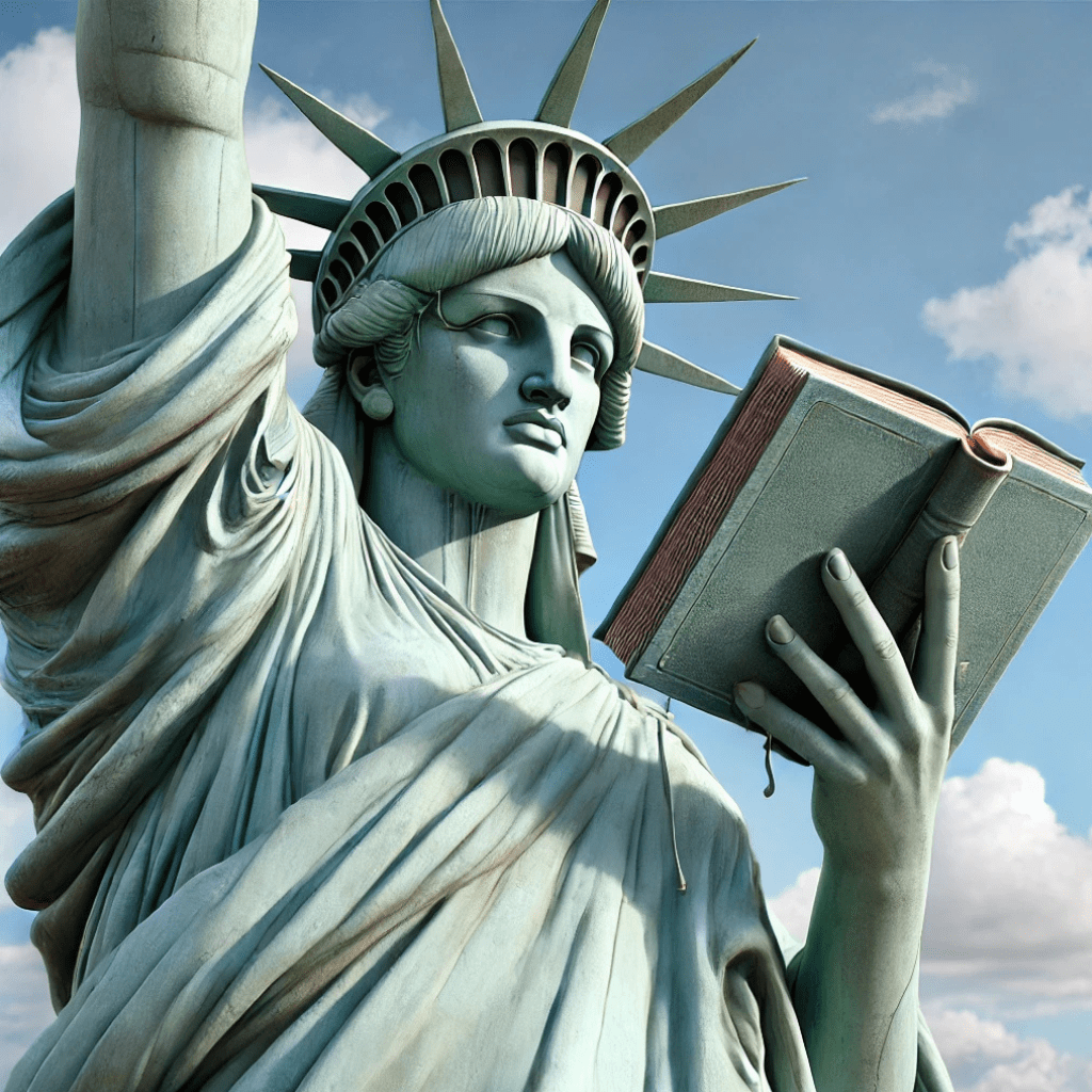 I wrote an essay on “The Many Definitions of Political Inequality.” I wanted a picture that illustrates politics, but in a scholarly way. An abstract “definitions of political inequality” would not work. So, to create the visual, I wrote into the program, “Photograph of the Statue of Liberty reading her book.” It came out well, though the distorted face is not ideal.