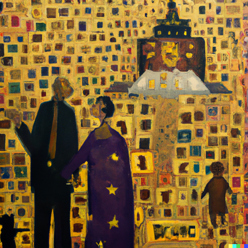 DALL-E generated this one, too. I inputted the information, “Klimt painting of democracy and money” for Afouxenidis’ guest post on “Neoliberalism and Democracy.” Gustav Klimt was an Austrian artist of the late 19th and early 20th Centuries and a master of the Art Nouveau style.
