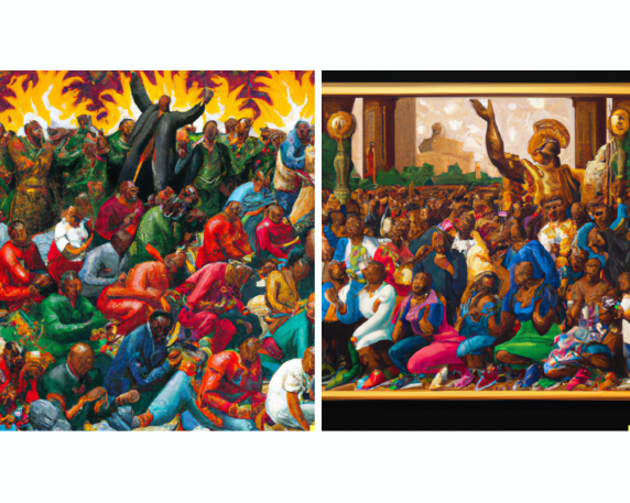 I have a difficult time interpreting some of the paintings. A good example of such is when I asked DALL-E, in 2023, for a “Kehinde Wiley painting of people protest.” Kehinde Wiley is an African American artist famous for his painting of President Obama. This is what I received: