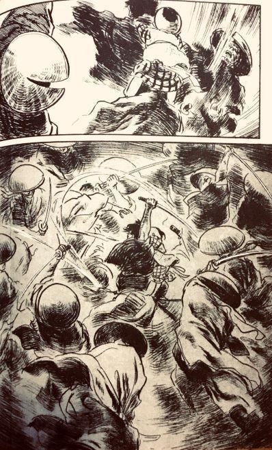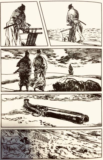 By Volume 8, Lone Wolf & Cub had won so many battles, even against armies of men, that they became legends. In some situations, to win, or to prevent a challenge, all Lone Wolf had to do was show up. Men would drop their swords instead of fighting him. The picture above, “Four Seasons of Death,” is a story of that type.
